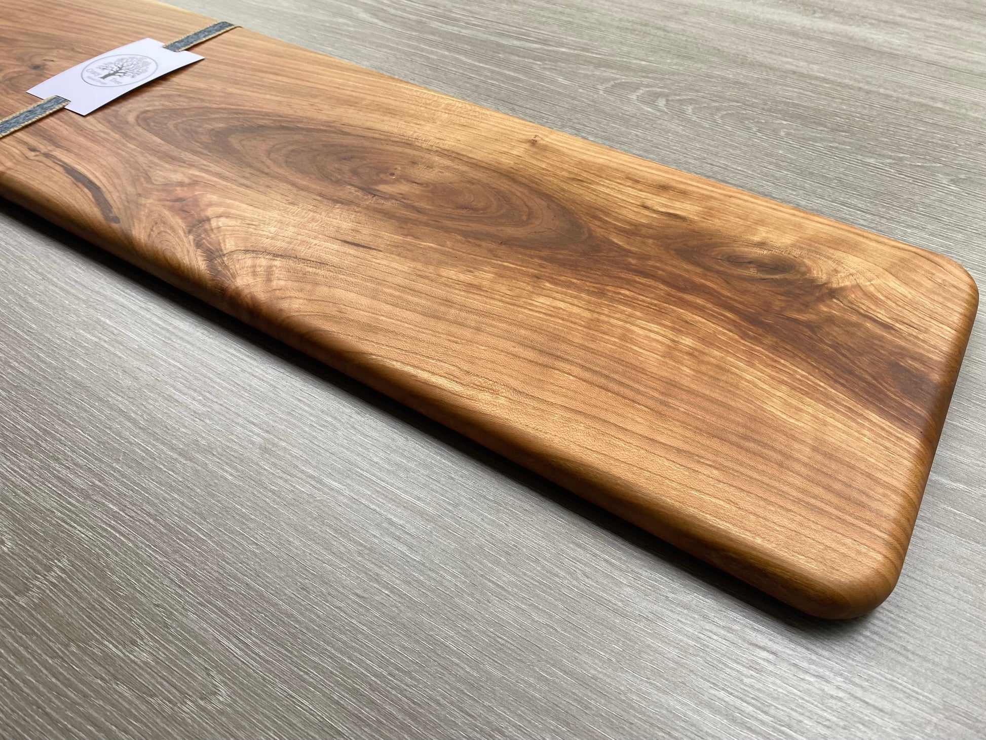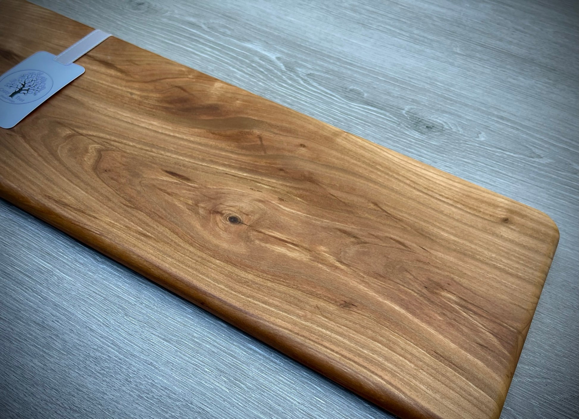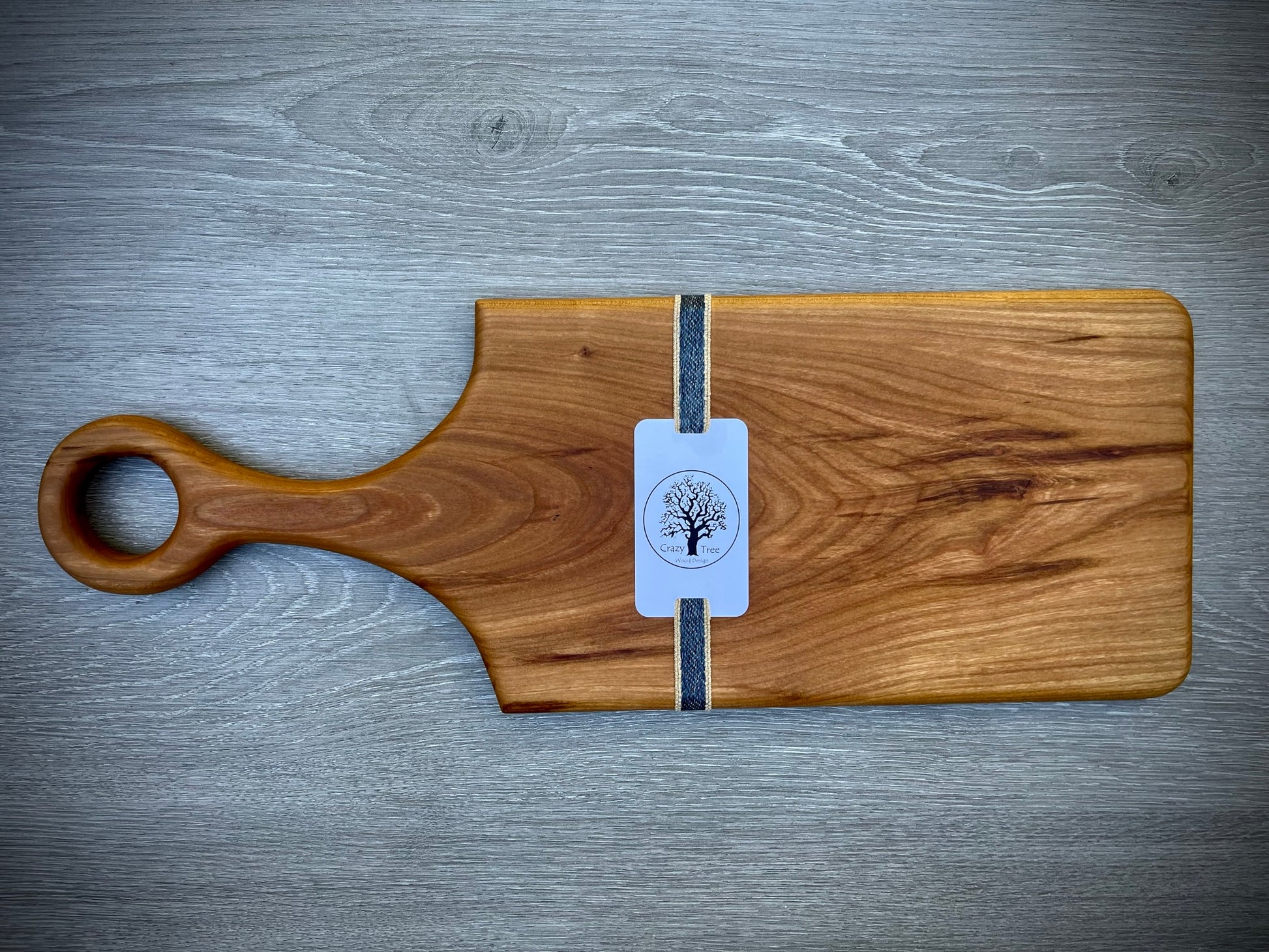 Hand crafted cherry charcuterie board with handle. The boards will vary in coloration and design due to the variation in the wood grain. The sizes are approximate and will vary slightly,