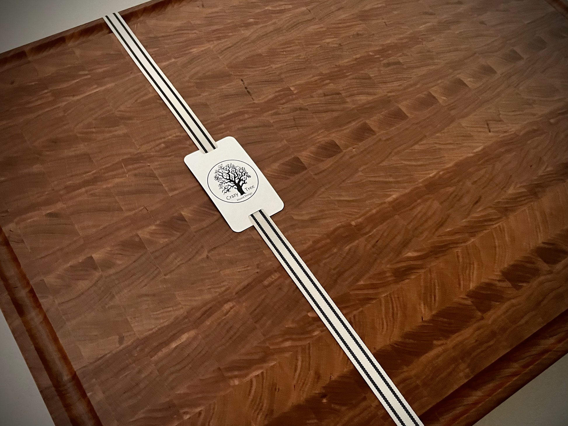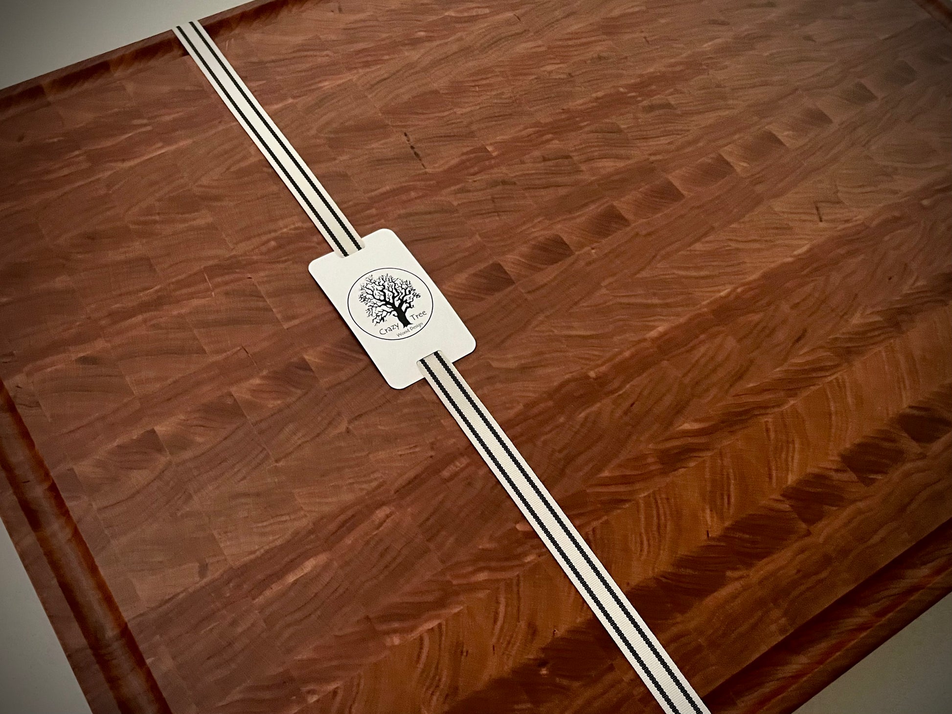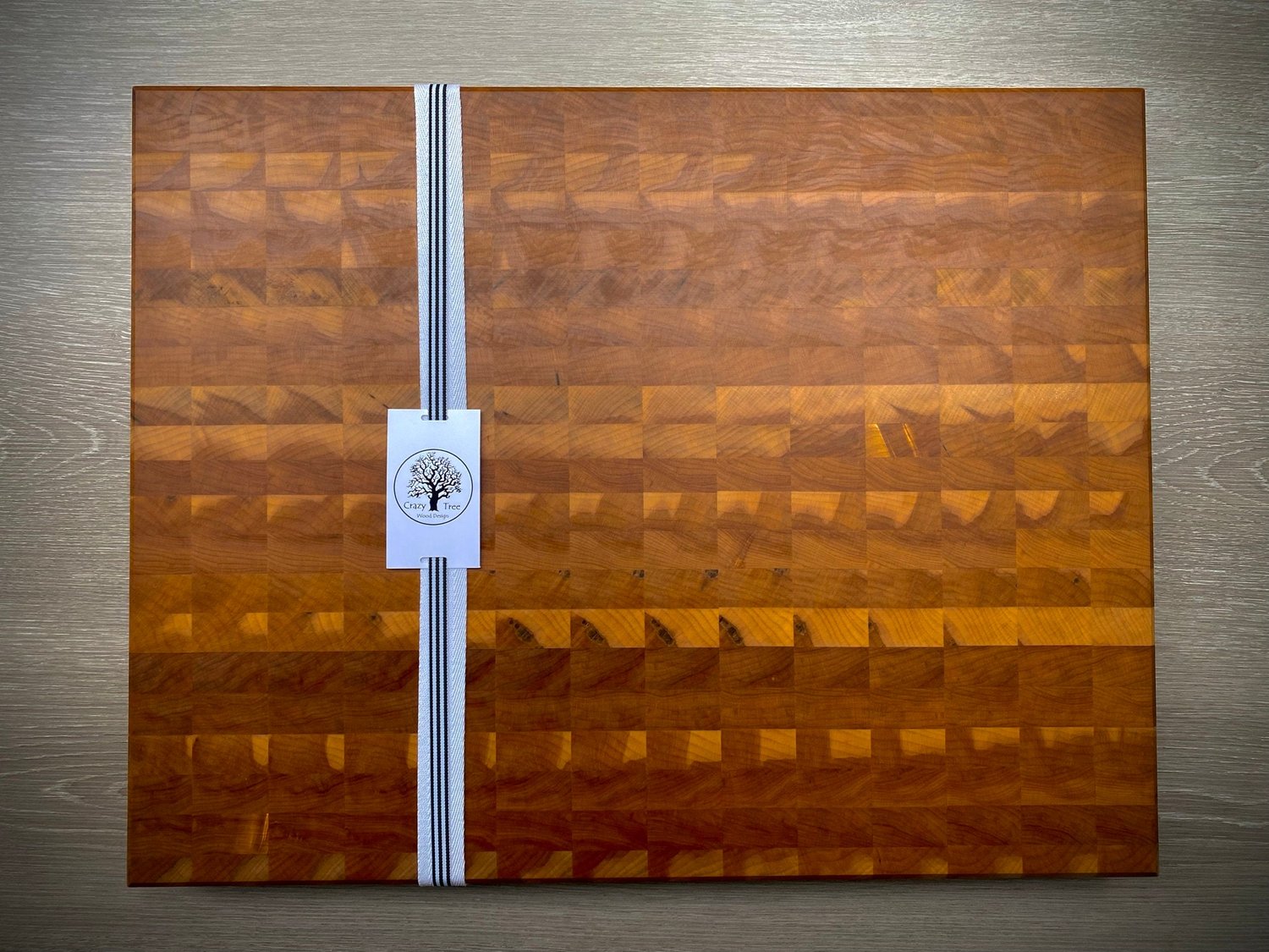 Hand crafted cherry end grain cutting board. The boards will vary in coloration and design due to the variations in the wood grain. The sizes are approximate and will vary slightly. All boards come with anti-slip rubber feet.