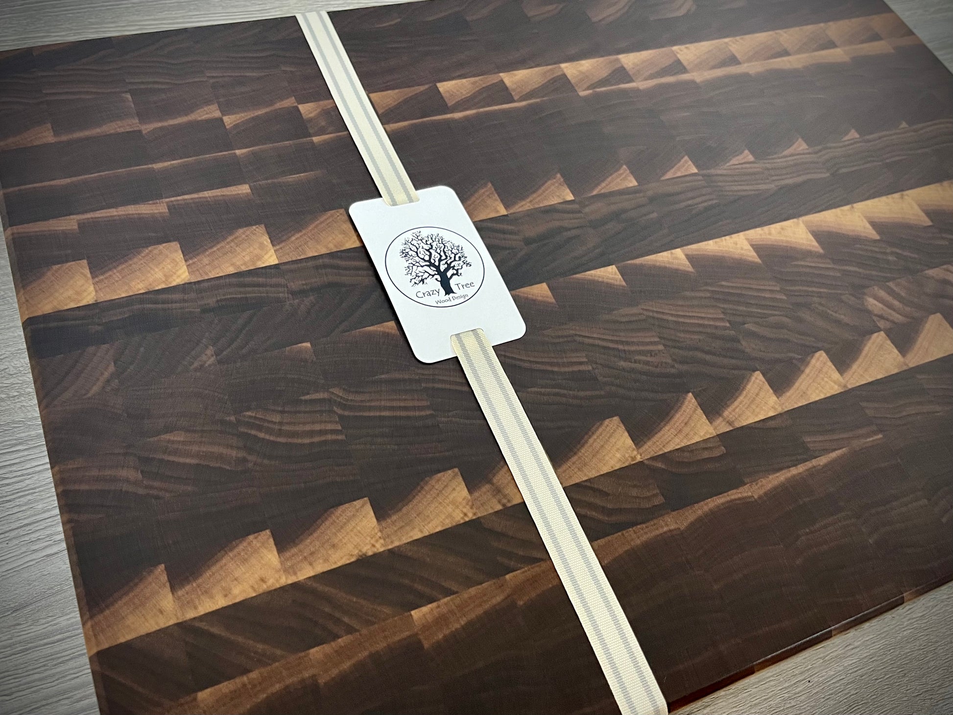 Hand crafted walnut end grain cutting board. The boards will vary in coloration and design due to the variations in the wood grain. The sizes are approximate and will vary slightly. All boards come with anti-slip rubber feet.