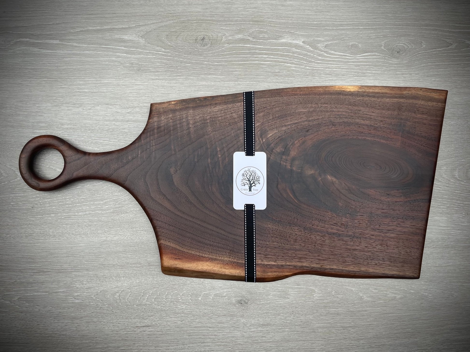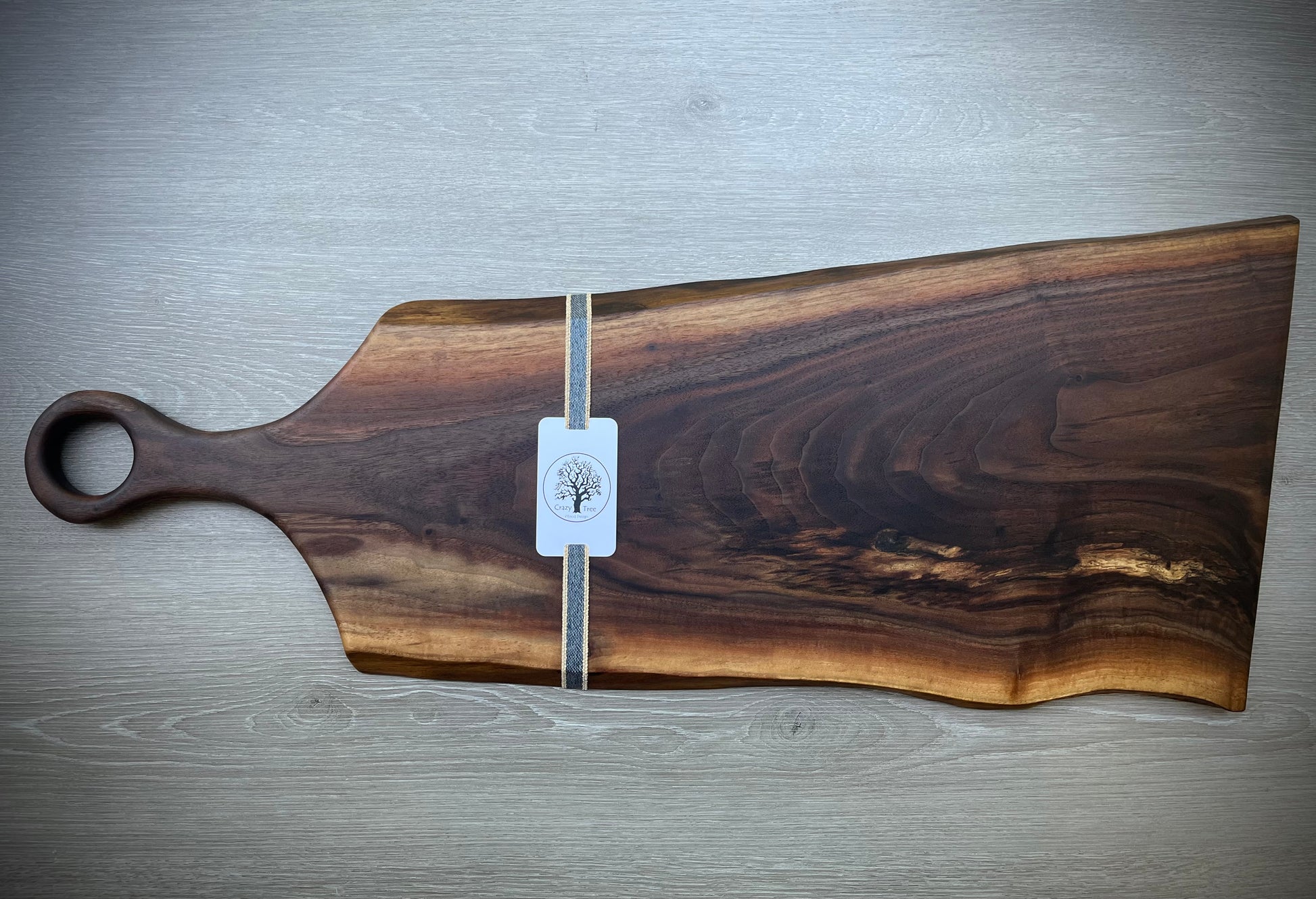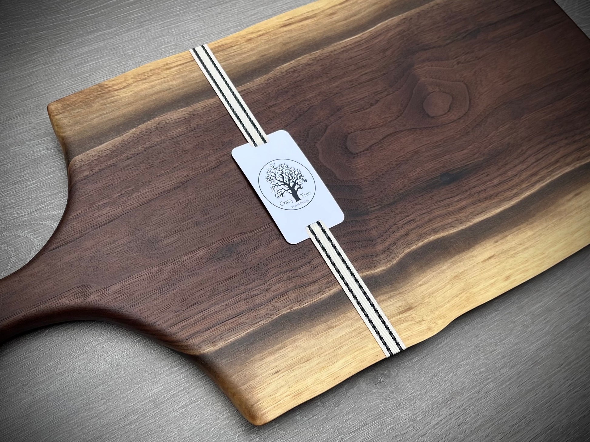 Hand crafted walnut live edge charcuterie board with handle. The boards will vary in coloration, shape, and design due to the variation in the wood grain. The sizes are approximate and will vary slightly,